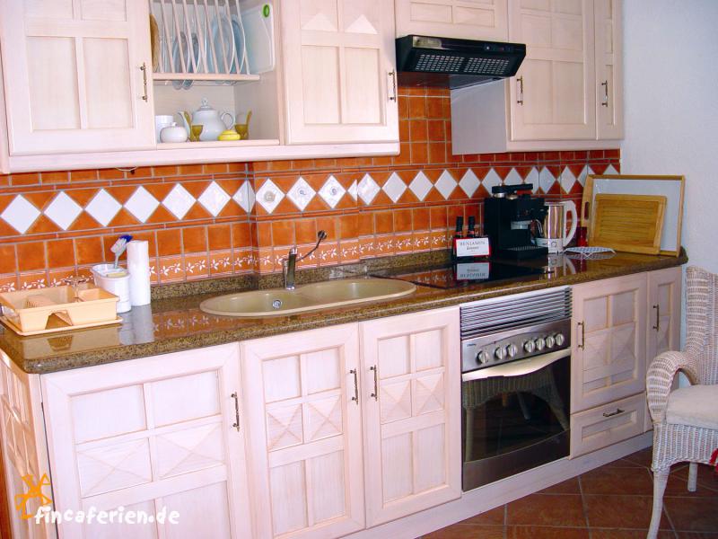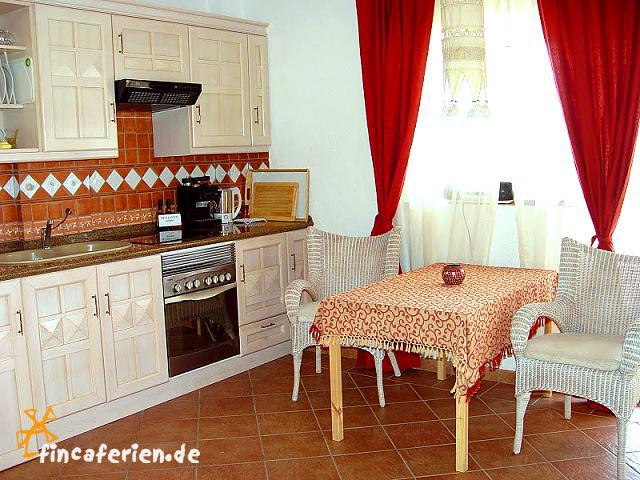 - offene Küche mit Ceranfeld, Backofen, Kühlschrank, Kaffeemaschine, Wasserkocher und Toaster